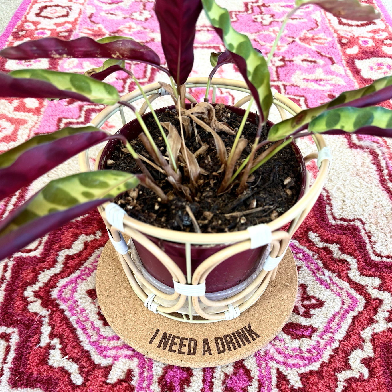 I NEED A DRINK // Funny Cork Plant Mat – Millennial & Gen Z Humor | Surface Protector | Houseplant Accessory